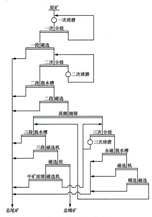 遼寧某選礦廠設計規模為年處理原礦石1300萬噸,由于礦石基本屬于難磨難選類型,結晶粒度細,精礦產品粒度相應也要細磨才能達到單體解離,球磨機磨機能力明顯下降,嚴重影響該選礦廠弱磁選的生產工藝主流程。