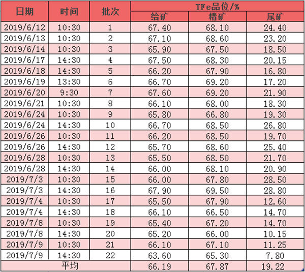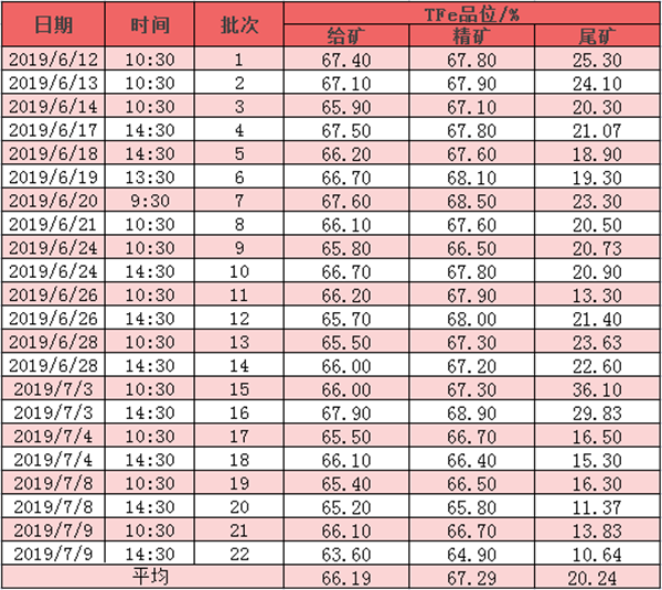試驗地點為四選作業區大選磁選柱間,試驗時間從2019年6月12日至7月9日。由四選作業區和生產技術室共同組織采樣;由生產技術室試驗室進行制樣、粒度篩析和化驗分析。