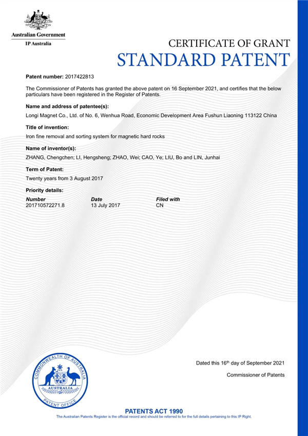 近日,隆基正式收到頑石除鐵系統(tǒng)澳大利亞專利證書,在頑石除鐵全球市場布局方面取得重要突破。