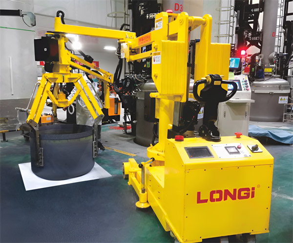 2020 年針對客戶單晶爐工裝零件拆裝難題,隆基推出熱場拆裝工裝車,最大程度保證了工件拆裝的效率和安全。設備采用伺服電缸驅動助力臂形式,可以單人輔助下,15min內拆卸熱場8大件,運行過程平穩,夾爪帶有夾取保護功能,不損壞工件。