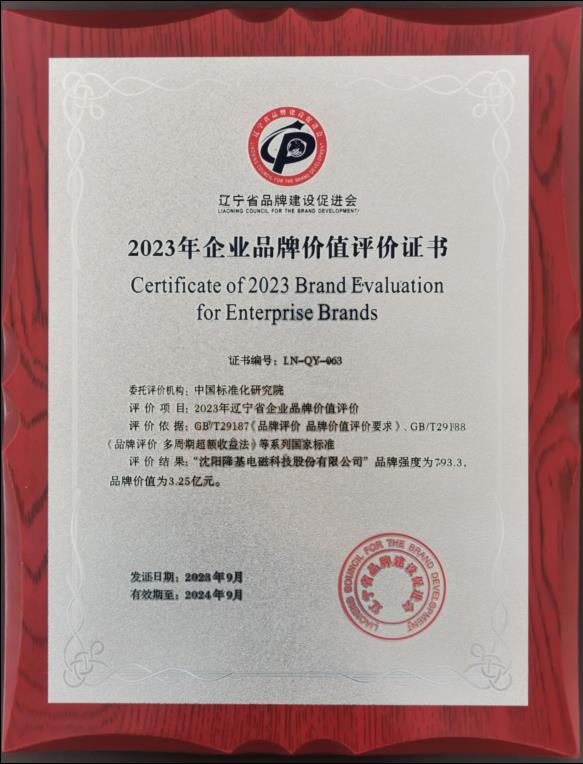 日前,遼寧省品牌建設促進會主持的2023年遼寧省企業品牌價值評價結果出爐。沈陽隆基電磁科技股份有限公司品牌價值3.25億元,品牌強度793.3,位于省機械制造類前列。